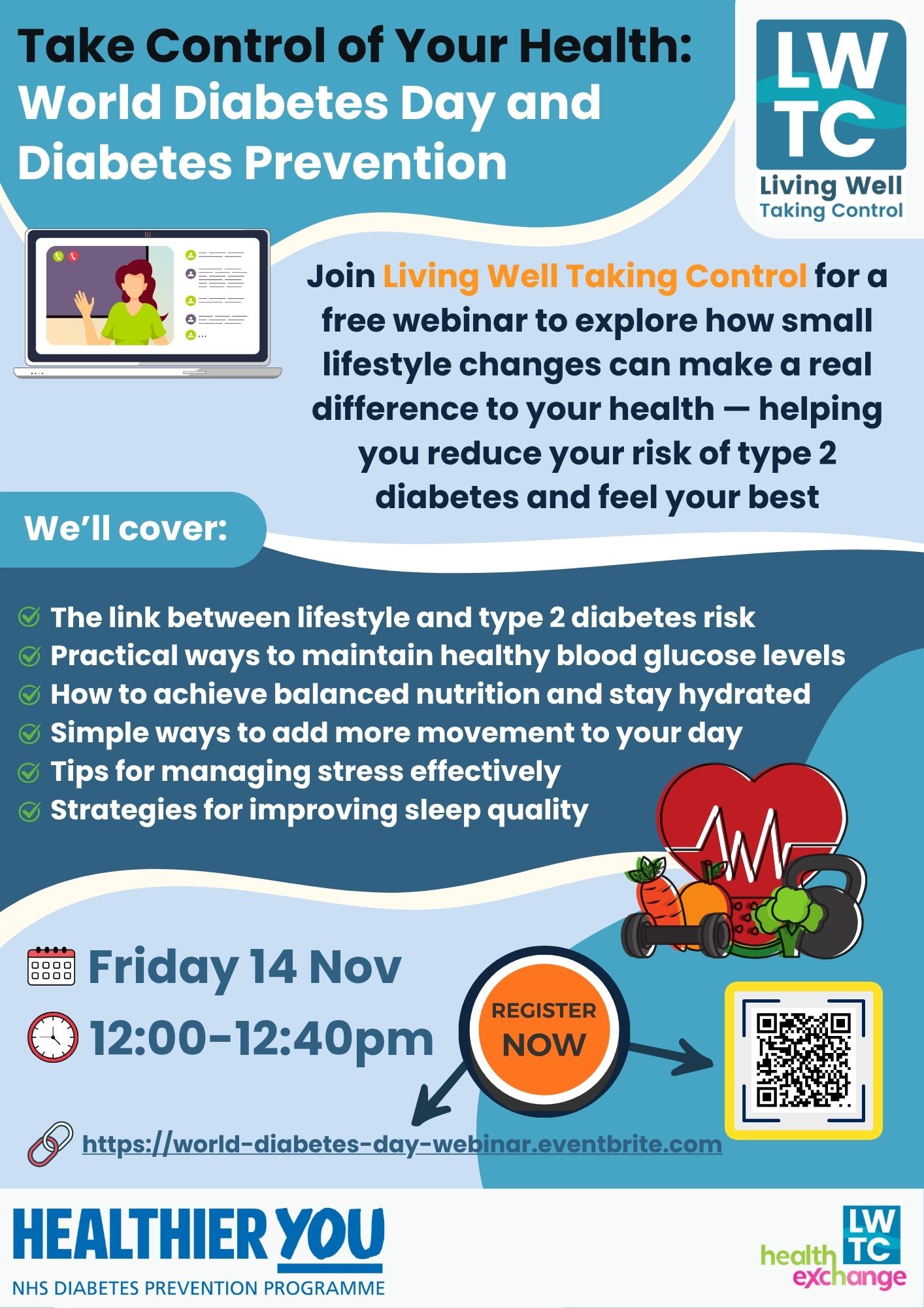 Join online and get your free ticket following the link: World Diabetes Day and Diabetes Prevention Webinar Tickets, Fri 14 Nov 2025 at 12:00 | Eventbrite